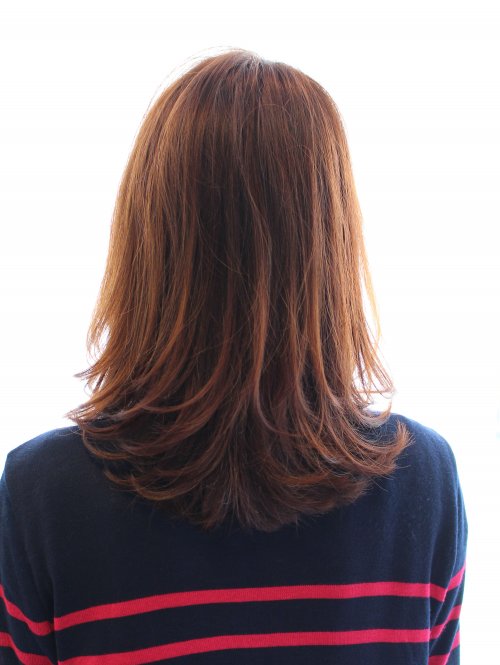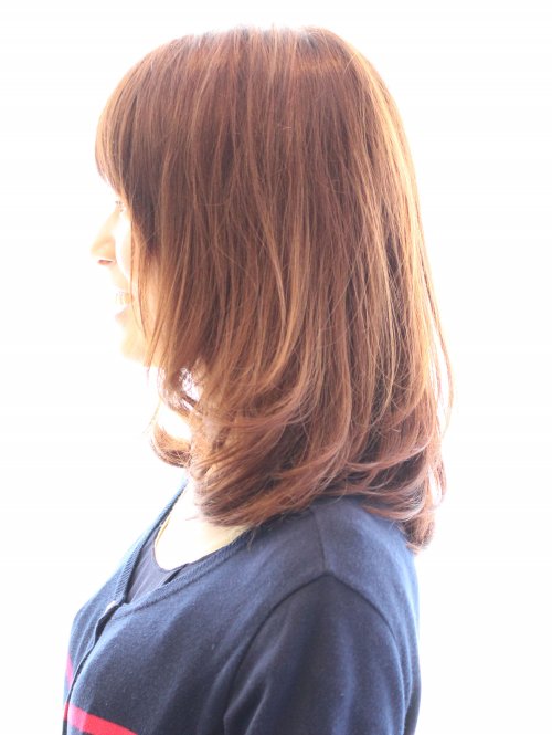 ピンク系のやわらかいブラウン☆低めのレイヤーで落ち着いたミディアムスタイル☆