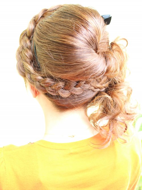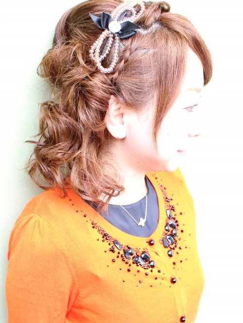 フロントサイドにかけて編み込み☆毛先はサイドによせてはなやかに☆結婚式、二次会、ホームパーティーにもおすすめスタイル☆